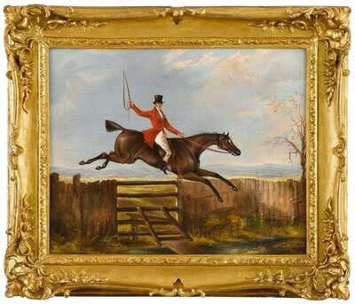 Oil on canvas, depicting a hunt scene of a mounted rider wearing a red coat and top hat, and holding his crop aloft, in mid flight leaping over a fence. Framed.