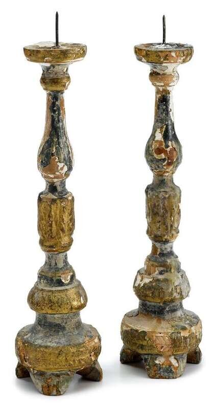 Pair of Continental limewood and polychrome pricket candlesticks 18th century