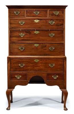Two parts: The molded top above three short drawers over three graduated long drawers, the base with single long drawer over two short drawers with plain shaped apron between, raised on cabriole legs terminating in pad feet.