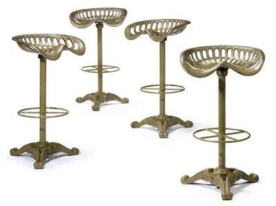 Converted tractor seats, stamped 'San Francisco Baker & Hamilton, Champion' raised on olive painted stand.