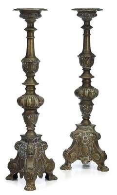 Each broad sconce above turned and knopped standard terminating in tripartite base above lions paw feet.