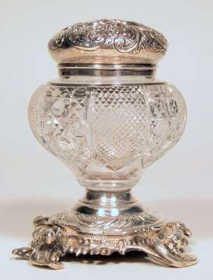 Bulbous form, the cut glass body surmounted by a rococo style repousse lid, raised on a spread circular rococo style base.