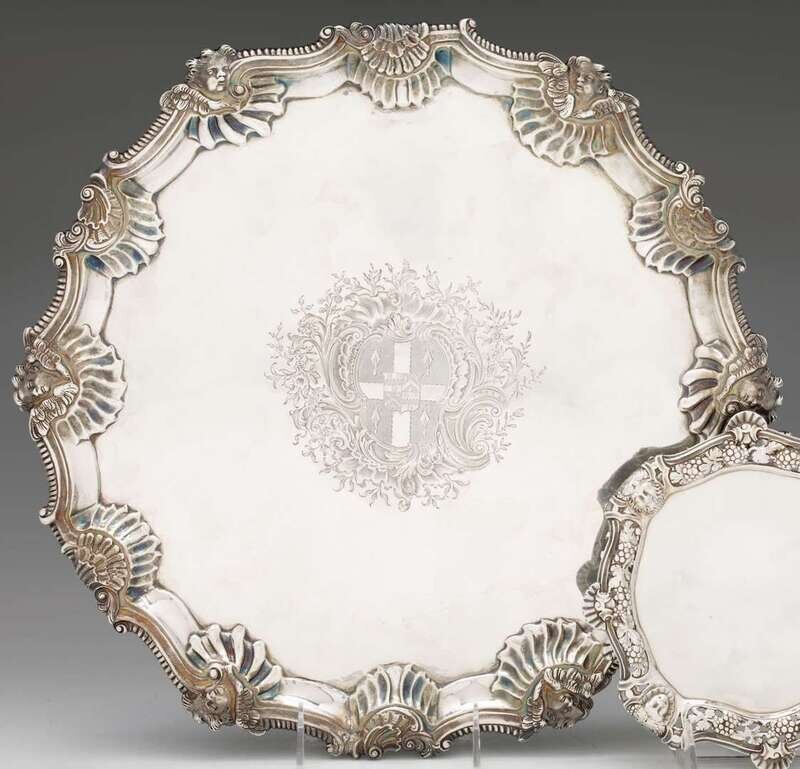 Shaped circular form, engraved with a coat-of-arms within cartouche, the rim shaped to show alternating cupid masks and scallop shells, raised on three inwardly scrolling feet.