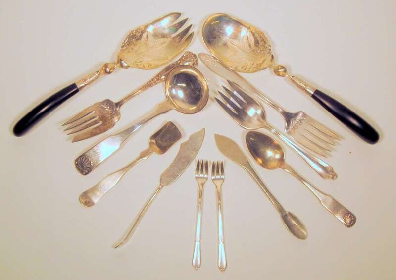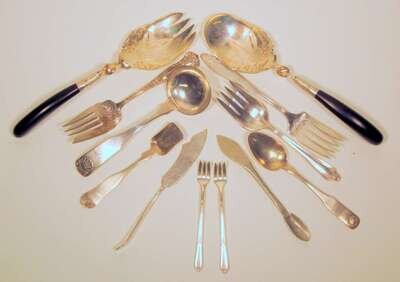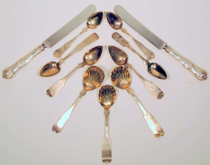 Including a ladle, marked Kirk, date letter C, the other a spoon, marked JB Jones, and 9 other coin silver spoons; together with 10 further pieces of sterling or silver plate flatware. (21).