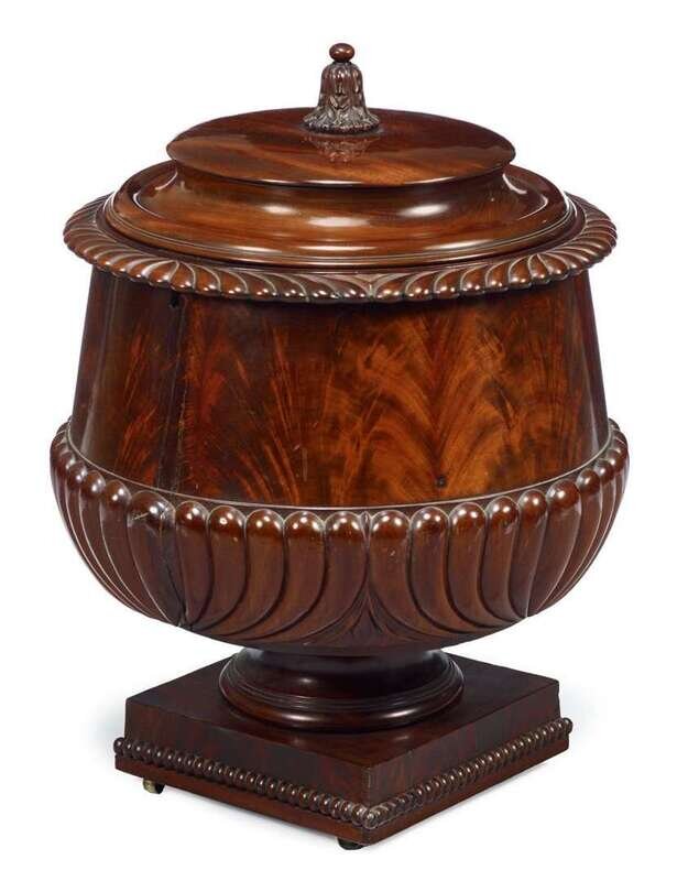 Of cylindrical form, the flattened domed cover surmounted by a carved finial opening to a lead-lined interior, the case with gadrooned edge, raised on square base.