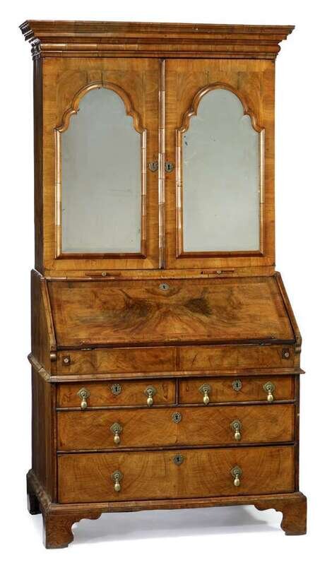 In two sections: the ogee molded cornice above twin arched and mirrored cupboard doors, opening to a four drawer compartmented interior, the fall-front base with satinwood four drawer interior and hidden slide compartment and leather inset surface, over two short and two long drawers, raised on shaped bracket feet.