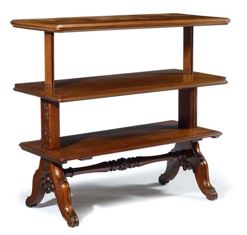 The molded rectangular free moving top surmounts a conforming second and third tier raised on vine carved tapering columns terminating on shaped legs and scrolling feet.
