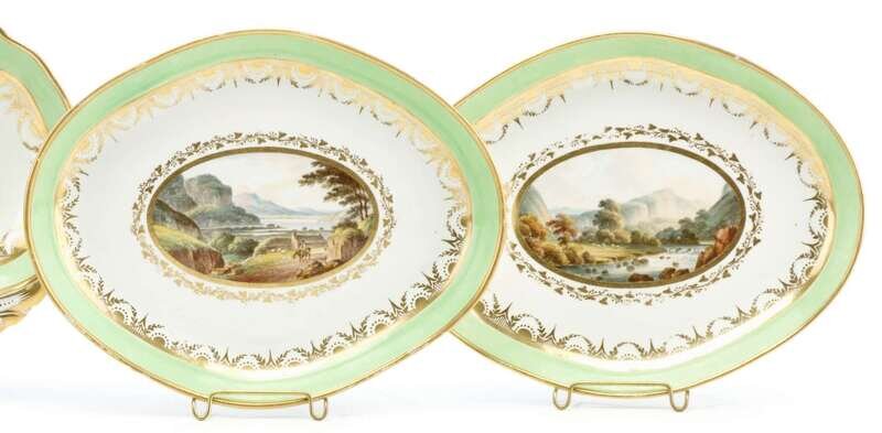 Oval form, each with a central reserve hand-painted with a topographical scene within a gilt boder, the rims glazed in mint green bordered in gilt, factory marks and captions to underside.