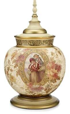Globular with a short neck, painted with an oval reserve of a young woman and child beside a bank, against a field of scrolling flowers and foliage on a cream ground with raised gilt details, the whole with 'lace' overlay; mounted as a lamp.