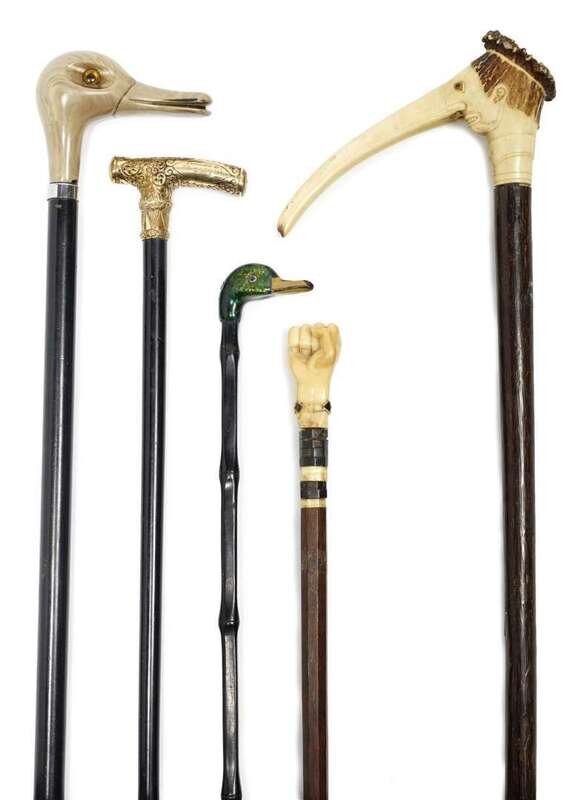 Including one sword stick, Japanese silver and ivory mounted sticks, several carved wood, enameled, and other examples. (42).