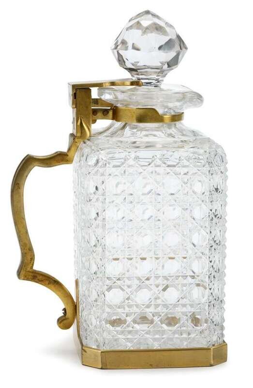 Unusual Victorian gilt metal mounted cut glass decanter lock plate stamped betjemann's patent