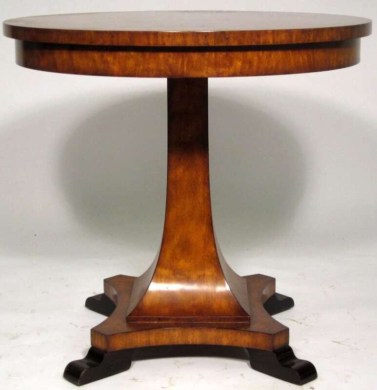 The crossbanded circular top surmounting a faceted column over quatrefoil base terminating in ebonized feet.