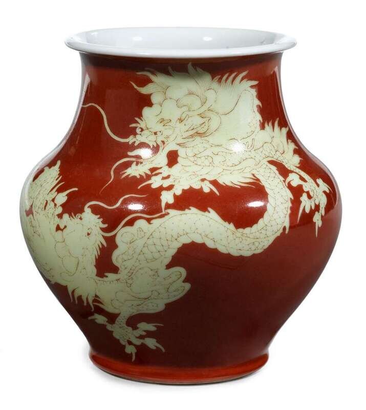 Wide baluster form, yellow dragon to orange ground, studio mark to base, together with four Japanese porcelain items.