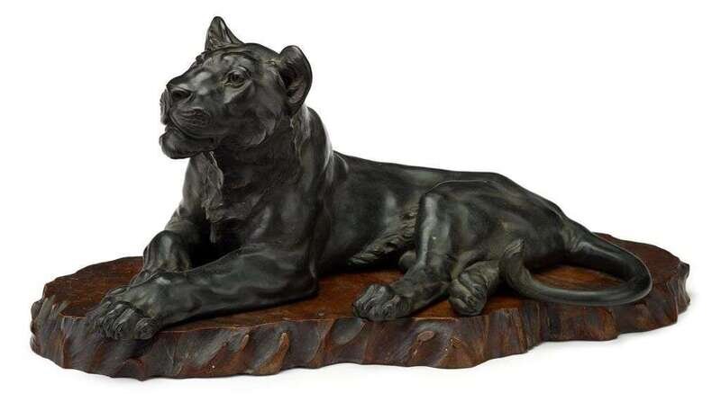 Large Japanese bronze figure of lion on burlwood stand 19th century