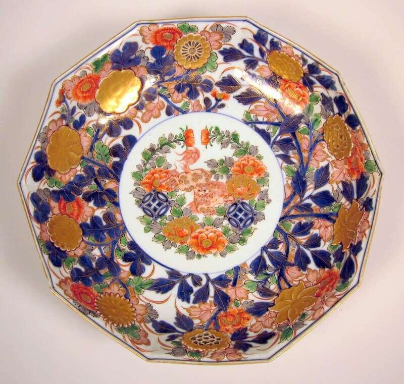 Octagonal U-shaped bowl with gilded and molded flowers and enameled peony and Fu lion medallion over conforming splayed foot.