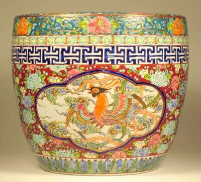 Deep U shape, central phoenix cartouche framed by foliate sprigs.