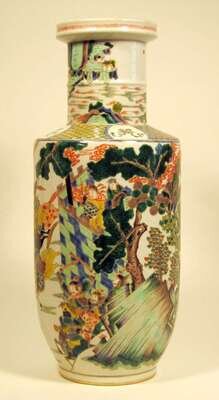 Kangxi style detailed enameled figural landscape to baluster vase.