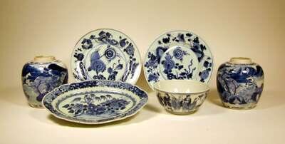 Comprising a pair of Kangxi floral dinner plates , a small diamond shape willow and peony garden meat dish, pair of small ginger jars (no lids), and a small bowl depicting Chinese men. (6).
