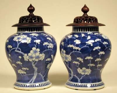 Baluster form, peony on blue ground, both with pierced wood lids.