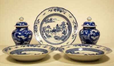 Grouping of five Chinese export blue and white porcelain items