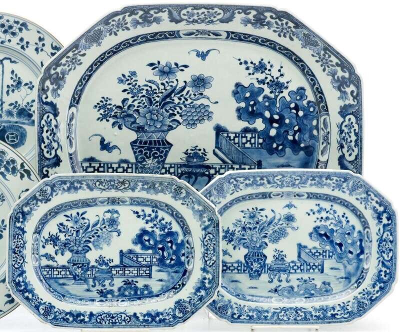 Comprised of a pair of rectangular trays, together with a larger tray underglazed to show fishing hamlet.
