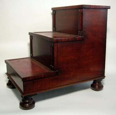 Rectangular red leather insert graduating set of three steps, opening to reveal porcelain chamber pot, raised on turned feet.