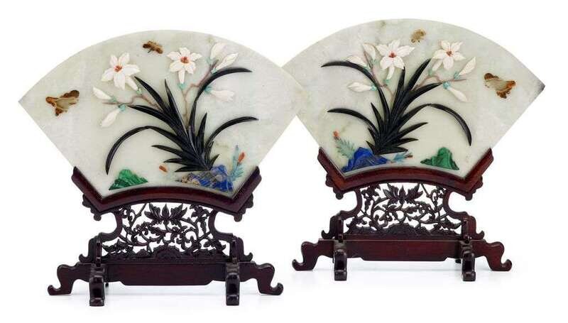 Pair of Chinese applied green stone fan form screens on stands