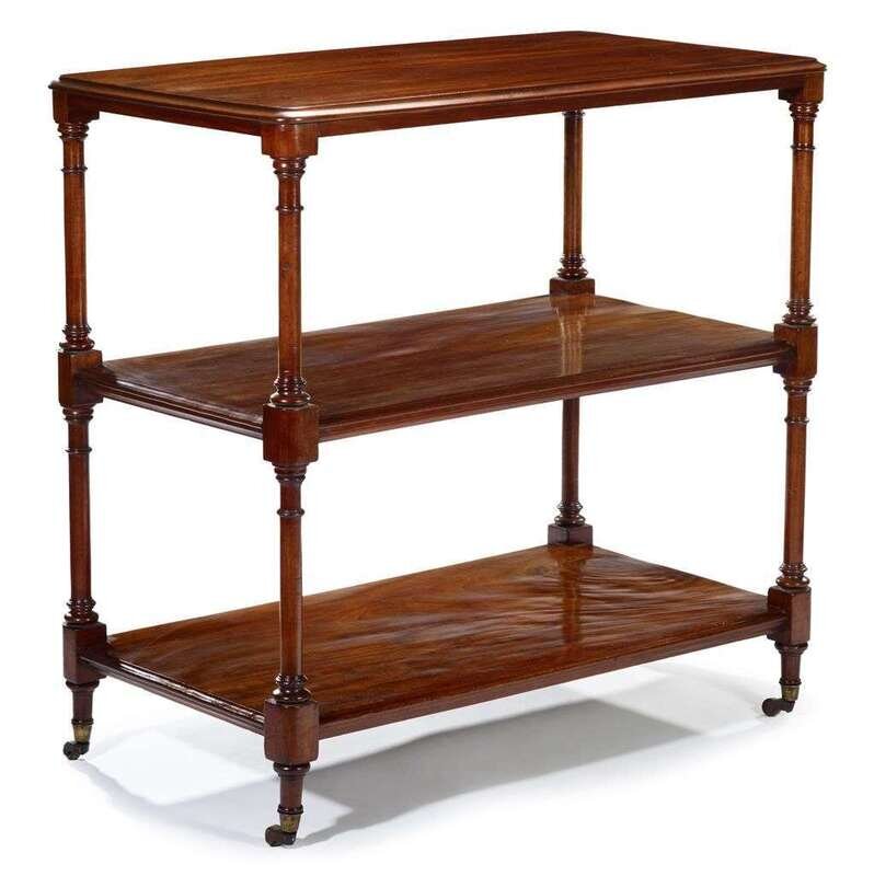 Molded rectangular top raised on turned columns supporting two under tiers, terminating on brass castors.