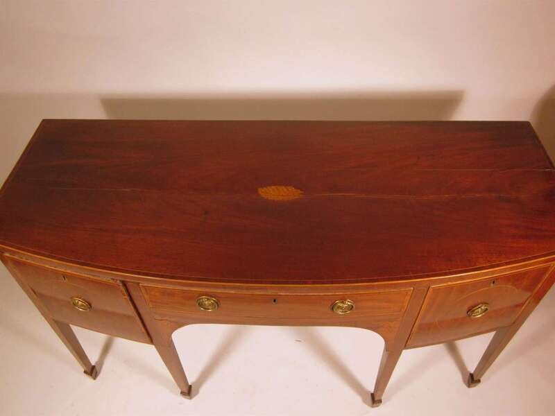 The crossbanded bow front top over a single short drawer flanked by deep drawers, raised on six tapering square legs with spade feet.