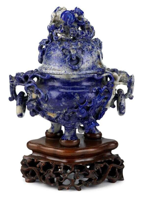 Chinese carved lapis lazuli covered censer on hardwood stand late 19th century