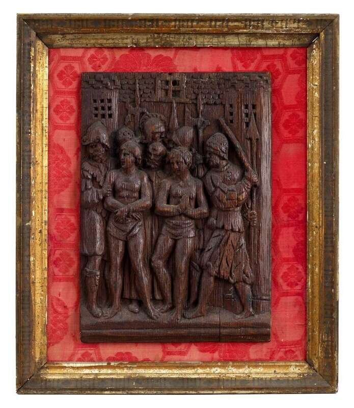 Tall rectangular form, carved in medium relief showing religious martyrs, mounted in later frame.