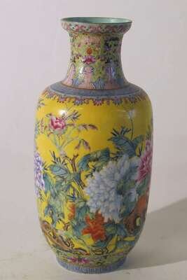 Baluster form, gilded rim turquoise counter to interior, the body worked to show profusion of peonies on yellow ground.