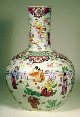 Long slender neck over wide body enameled to show figural landscape and celestial beings.