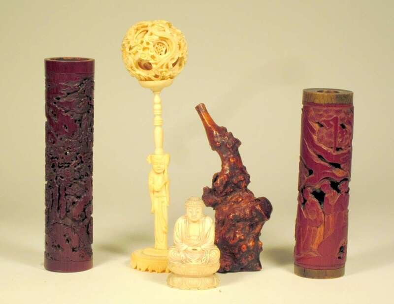 Together with a rootwood josstick holder, a Chinese Canton ivory puzzle ball on stand and an ivory Buddha. (5).