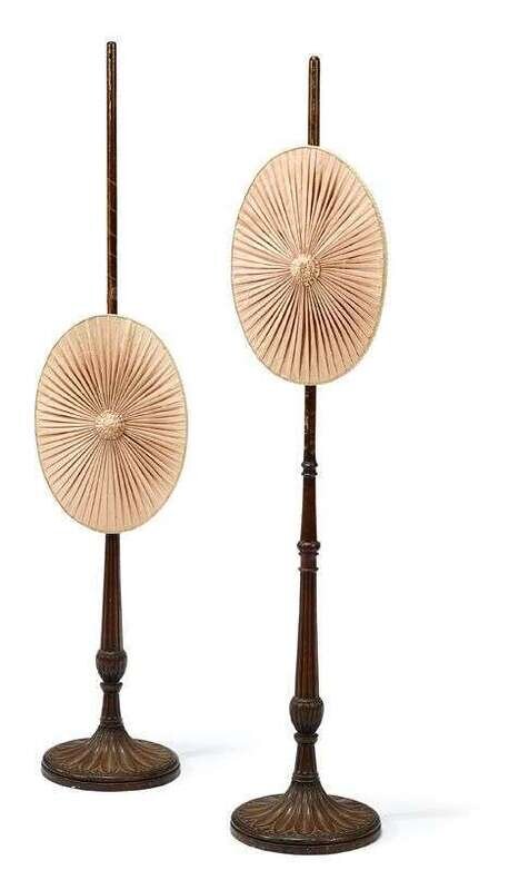 Each with a turned and fluted shaft supporting an oval gathered pink silk screen, on a leaf carved circular foot. (2).