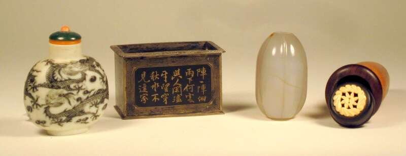 Comprising a porcelain snuff bottle with spurious Qianlong mark, gourd cricket cage, agate carving and bitong cage.