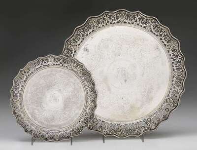 Each of circular form, both with pierced rim worked to show flowerheads and scrolls, the centers engraved with floral scrolls and centered by a monogram.
