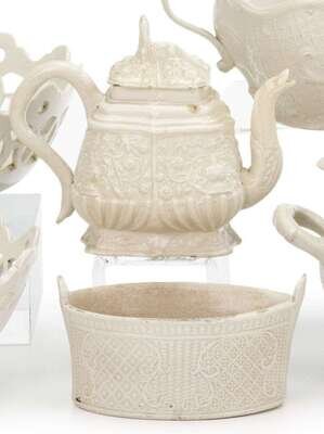 The teapot of cube form, the body worked to show urns, floral sprays, and masks, the lid with a finial in the form of a ?weasel; the bowl of oval form, the sides decorated in 'dot, diaper and basket', to show stars and dots in latticework. (2).