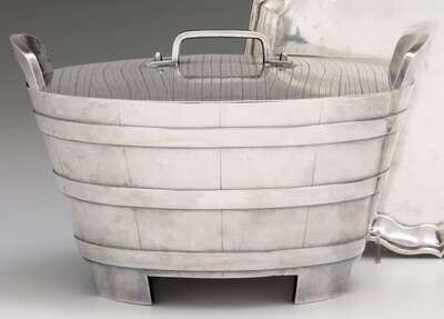 Of coopered barrel form with two handles, the pull-off cover and sides worked to simulate wood grain. Impressed marks to underside.