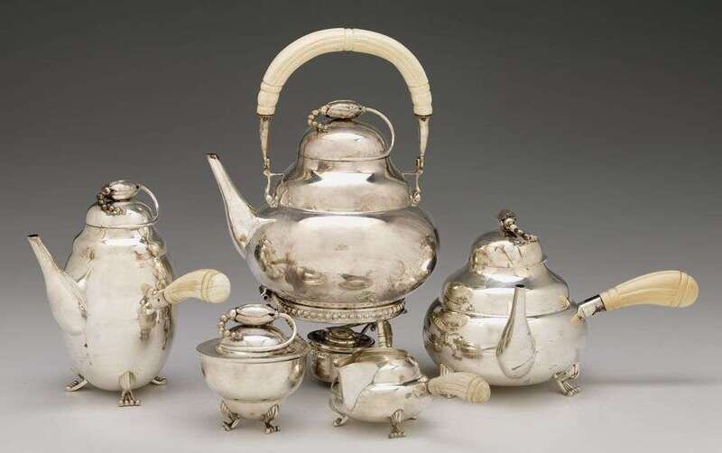 Comprising a hot water kettle and stand with burner, teapot, coffee pot, covered sugar bow, waste bowl and creamer, all in the Jensen 'Blossom' style with ivory handles. (6).