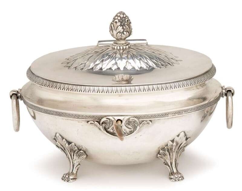 Oval form, the hinged lid mounted with a leaf design surmounted by a berry finial, leaf-tip frieze to the rim, the waisted body mounted with free moving handles, raised on four acanthus capped paw feet.