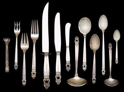 Comprising twelve dinner knives, twelve salad forks, twelve dinner forks, twenty-seven tea spoons, sixteen sugar spoons, ten butter knives, eleven soup spoons, and three other service items (approx 102).