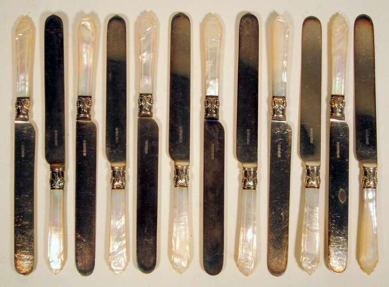 Twelve mother-of-pearl and silverplate mounted table knives late 19th century