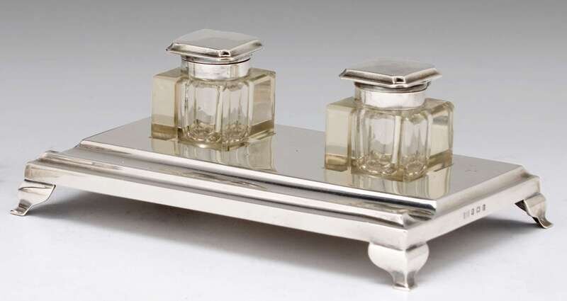 The rectangular tray with pen trough supports two molded glass silver topped inkwells.