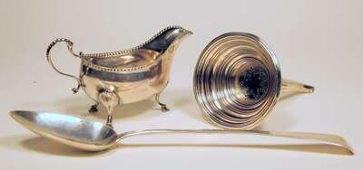 Comprising an Irish Georgian sterling silver gravy boat, a Georgian stuffing spoon, Soloman Hougham, London, 1805, and an Edwardian sterling silver wine funnel, Sheffield, 1909. (3).
