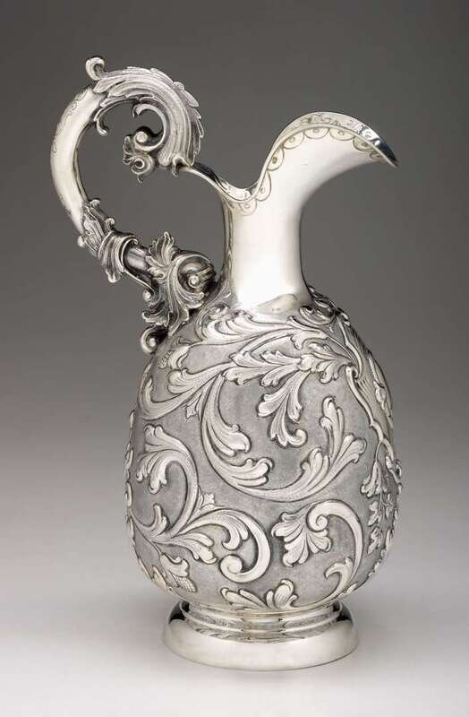 The repousse decorated body with vacant cartouche mounted with engraved scrollwork handle. Stamped 925 to underside.