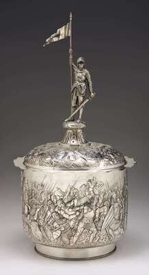 The round bowl finely repousse worked to show a mediaeval battle scene, the cover similarly worked and surmounted by a large figure of a knight holding a standard.