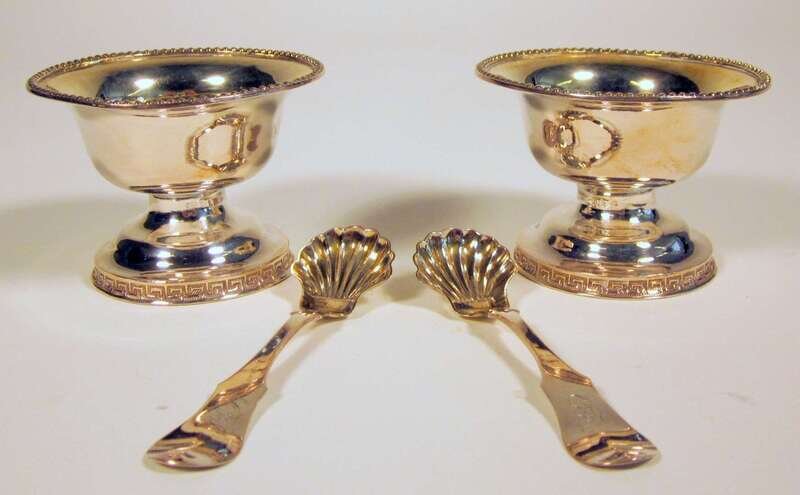 Pair silver salt cellars and spoons philadelphia, conrad bard & son, early 19th century