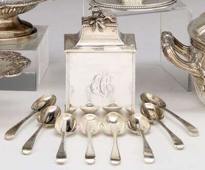 Tall square form, with featherbanded angles, monogram and armorial device on two sides, the tent-form lid surmounted by a rose finial, in original green pebble grained morocco box with red velvet lining containing eight associated sterling silver teaspoons.