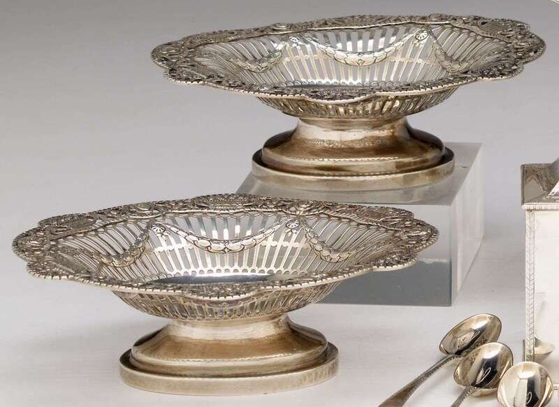 Oval form, each worked to show baskets of flowers, swags, and masks, raised on circular foot.